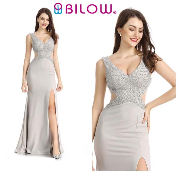 Vestido gris con escote V con pedrerÃa, transparencias en la cintura con corte sirena y con una lÃnea de corte en la pierna.
