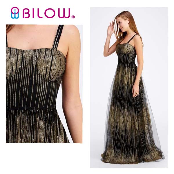 Vestido con tirantes y faldon en tull negro con destellos dorados, sencillo pero elegante.