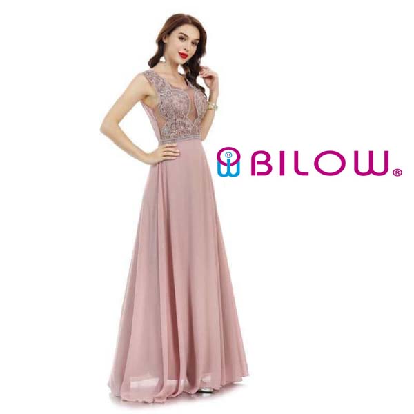 Vestido con tela tornasol plateado con pedrerÃa brillante en escote y cintura.