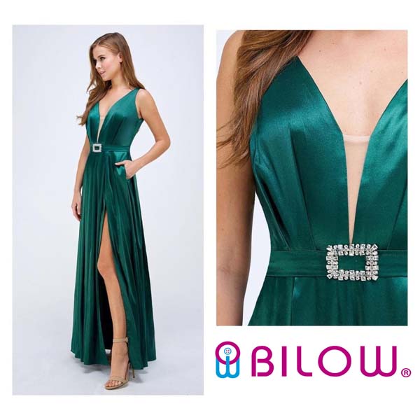 Vestido largo color verde botella con cinto en pedrerÃa.