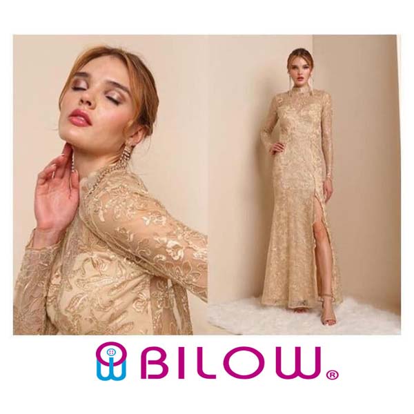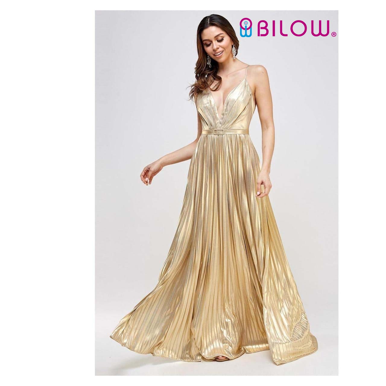 Vestido de noche color dorado con flores bordadas y con una lÃnea de corte en la pierna. Sin duda una vestido muy elegante para tu evento.