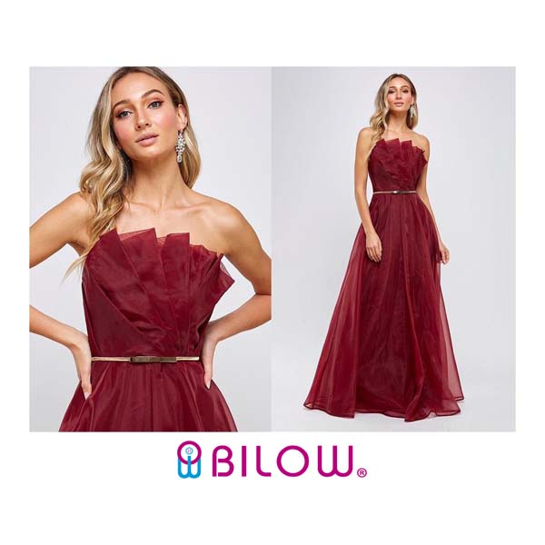 Vestido de noche color vino strapple, cuenta con el cinto dorado lo cual lo hace ser un vestido muy elegante.